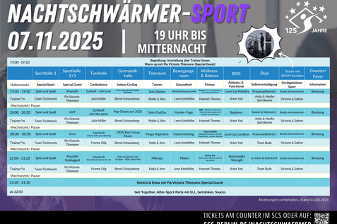 Am Freitag, den 07. November 2025, laden wir euch ab 19:00 Uhr zum Nachtschwärmer-Sport im Rahmen unseres Jubiläums 125 Jahre Sport Club Siemensstadt …