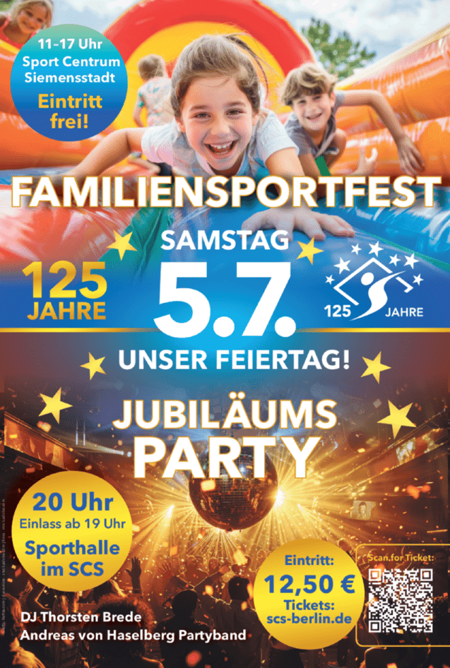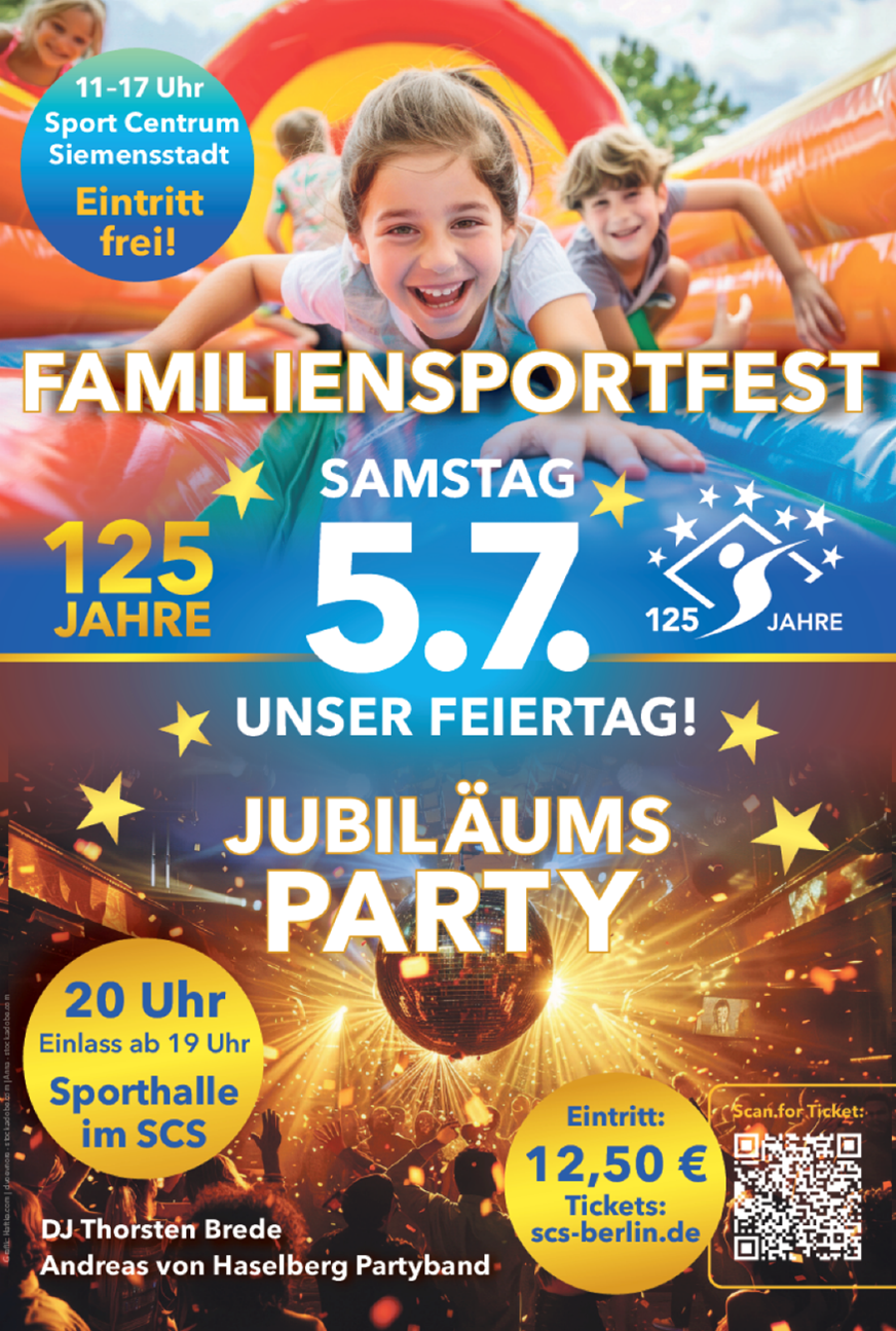 Der Sport Club Siemensstadt Berlin e.V. feiert in diesem Jahr sein 125-jähriges Jubiläum mit einem vielfältigen Programm, das sportliche Highlights, emotionale Momente und gemeinschaftliche Aktionen vereint. Der offizielle Festakt am Freitag, den 4. Juli 2025 sowie das große Vereinsfest am Samstag, den 5. Juli 2025 im Sport Centrum Siemensstadt stehen dabei im Mittelpunkt der Feierlichkeiten.