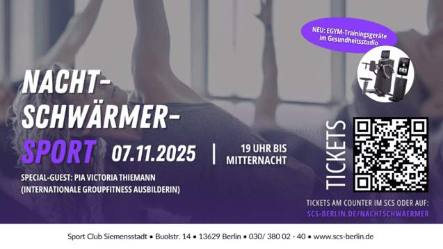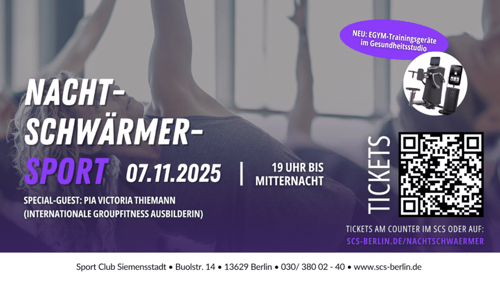 „Nachtschwärmer-Sport“ findet am Freitag, den 7. November 2025, im Sport Centrum Siemensstadt statt und richtet sich an alle ab 16 Jahren. Tickets sind für 10,- Euro erhältlich – entweder online unter www.scs-berlin.de/nachtschwaermer oder direkt am Counter im SCS.