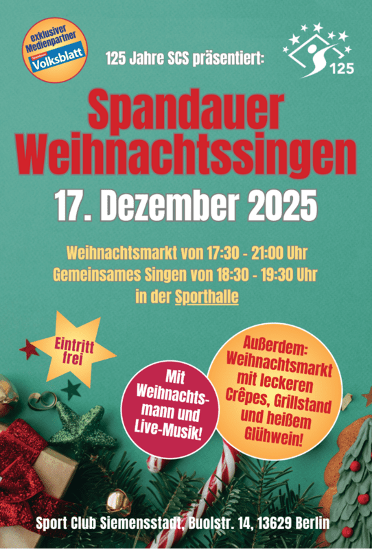 Wenn Musik, Licht und Gemeinschaft aufeinandertreffen, beginnt die schönste Zeit des Jahres: Weihnachten. Auch in diesem Jahr lädt der Sport Club Siemensstadt wieder zum traditionellen Spandauer Weihnachtssingen ein – einem stimmungsvollen Fest, das Gemeinschaft, Freude und festliche Atmosphäre miteinander verbindet. Die Veranstaltung findet am Mittwoch, den 17. Dezember 2025, von 17:30 bis 21:00 Uhr auf dem Vereinsgelände statt und verspricht, Groß und Klein in vorweihnachtliche Stimmung zu versetzen.