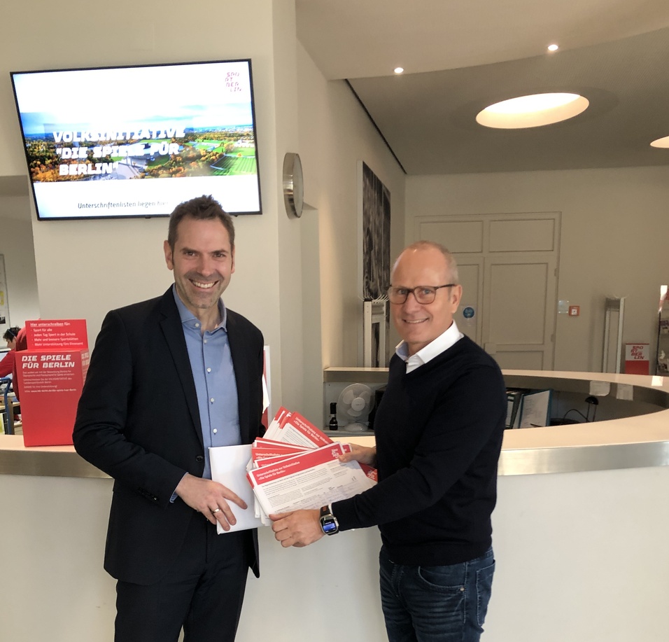 Am 19.11.2025 überreichte unser Geschäftsführer Jens-Uwe Kunze über 800 Unterschriften zur Volksinitiative „Die Spiele für Berlin“ an den LSB-Direktor Friedhard Teuffel im Landessportbund Berlin.