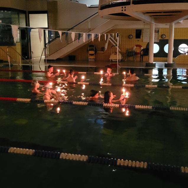 Wenn das Licht in der Schwimmhalle verlöscht, tauchen hundert Kerzen die Halle in ein zauberhaftes Licht. Das jährliche Kerzenschwimmen ist das Highlight am Endes eines vielfältigen Jahres und eine langjährige Tradition. Am 11.12.2025 veranstalteten die Schwimmtrainer zunächst 30 Minuten bunte Spielstaffeln in gemischten Trainingsgruppen, wobei die Mannschaften mal ganz andere Aufgaben im Wasser zu bewältigen hatten und mit viel gemeinsamen Spaß, um den „Sieg“ kämpften. Dann ging das Licht in der gesamten Halle aus und viele, fleißige Weihnachtswichtel entzündeten Kerzen, mit denen die Kinder durch das dunkle Wasser schwimmen mussten.