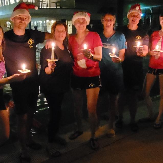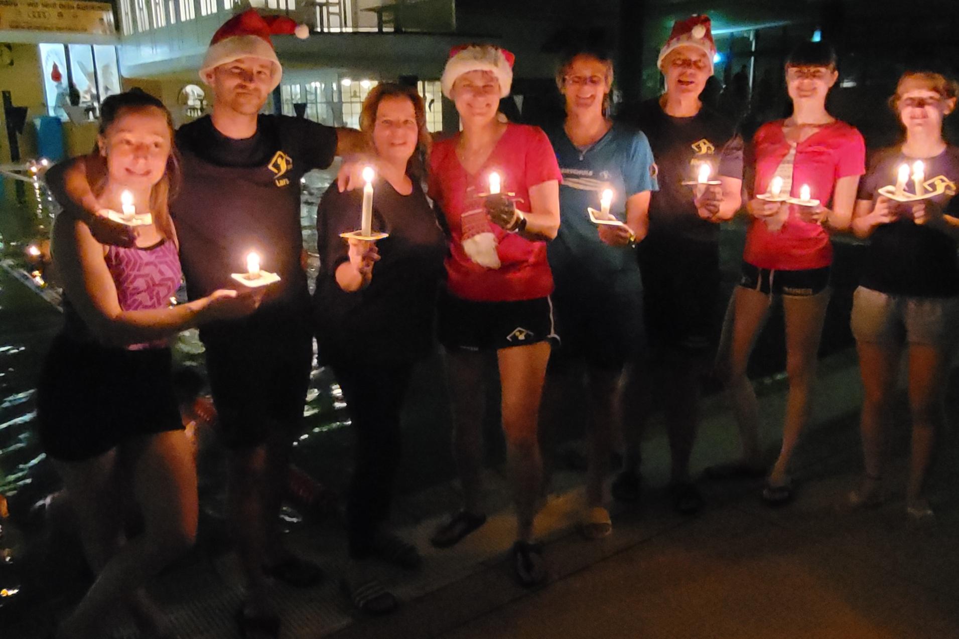 Am Beckenrand waren viele, bunte Kerzen aufgestellt. Diese ganz besondere Stimmung im und außerhalb des Wassers wurde unterstrichen durch Weihnachtsmusik.