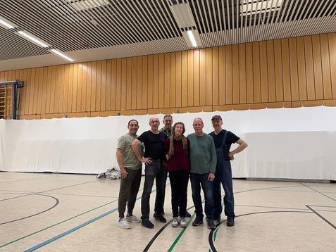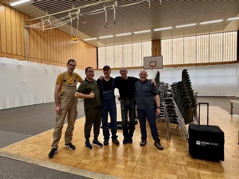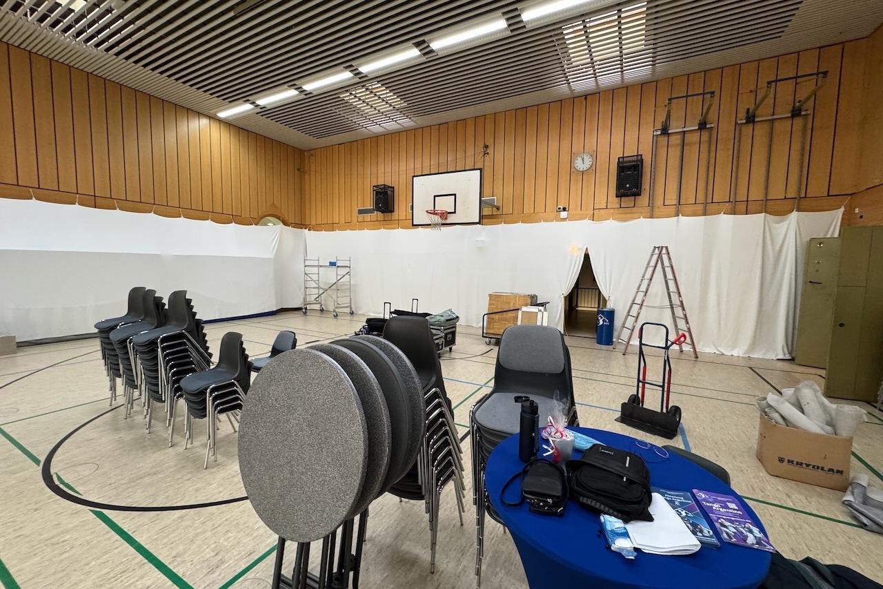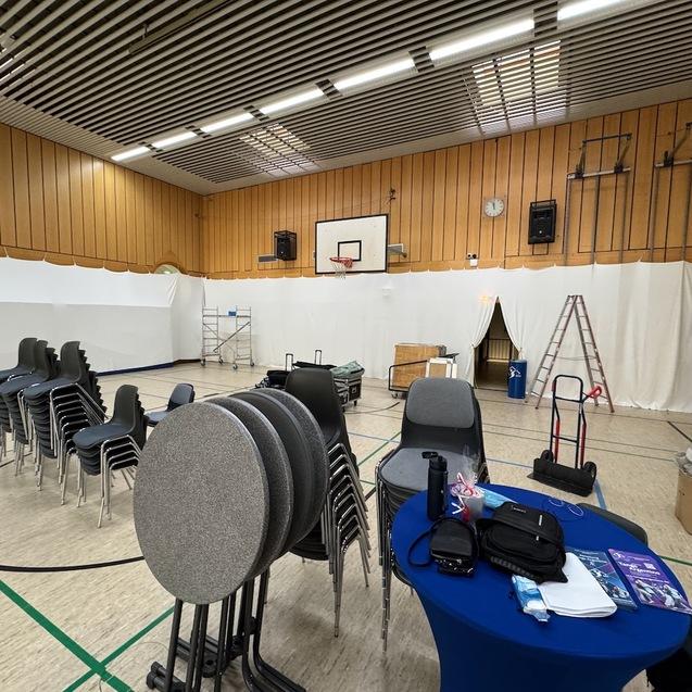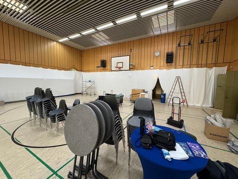In nur 5,5 Stunden verwandelte das sechsköpfige Aufbauteam die Turnhalle in einen festlichen Saal: Abgehängte Wände, Teppiche auf dem Boden, 17 Biertische, 136 Stühle, Parkett sowie Musik- und Lichttechnik sorgten für eine besondere Atmosphäre.