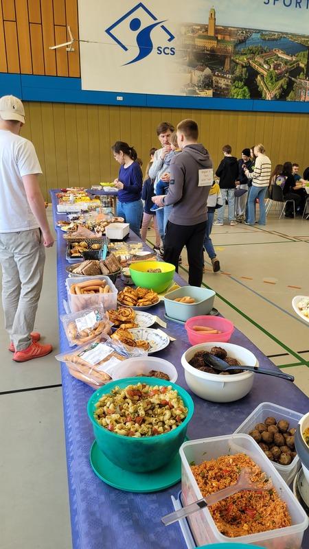 Nachdem alle Schwimmdisziplinen abgeschlossen und die Halle wieder auf Vordermann gebracht war, zog die gesamte Schwimmfamilie – samt Eltern und Geschwistern – in die Sporthalle um. Dort verwandelten viele fleißige Hände die Halle in eine gemütliche Partylounge. Ein riesiges, liebevoll gestaltetes Buffet sorgte für die nötige Stärkung nach dem sportlichen Vormittag. Währenddessen konnten sich die Kinder in der Nachbarhalle bei Bewegungsspielen und kleinen Staffeln weiter austoben – unterstützt von begeisterten Eltern.