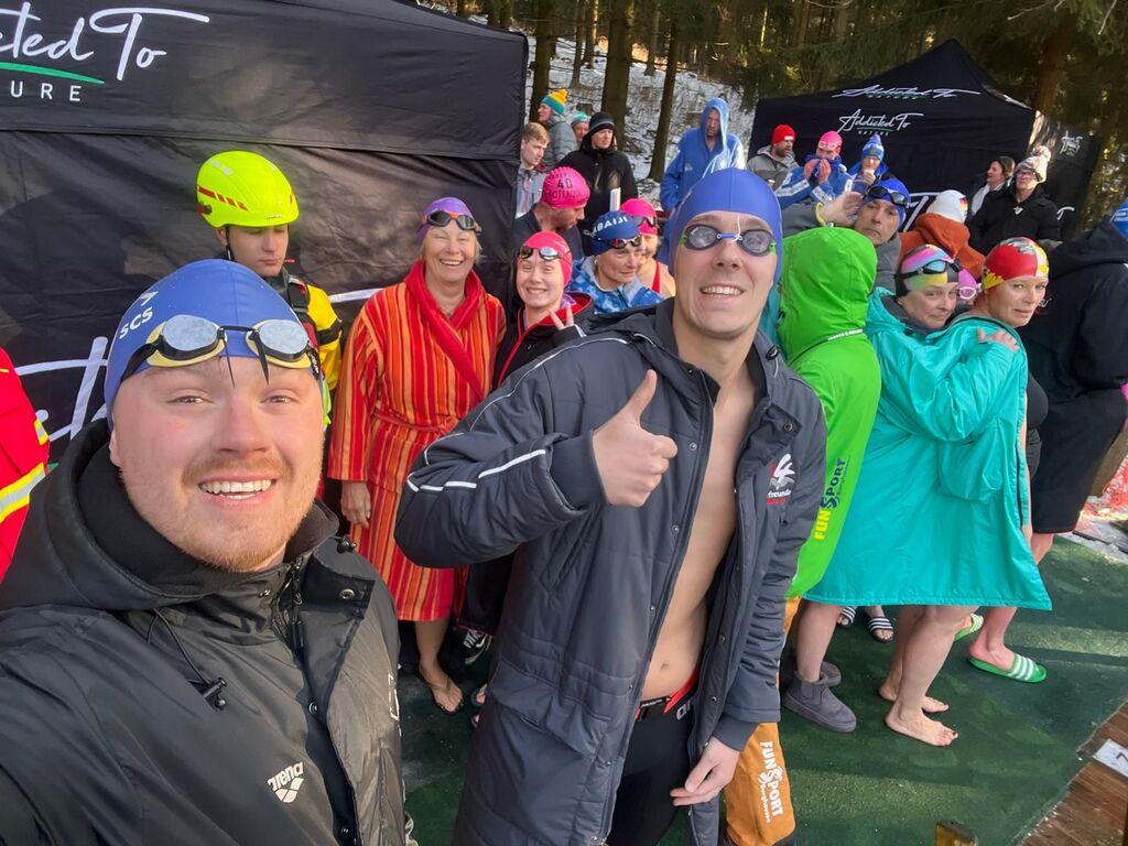 Der Wettkampf selbst startete kurze Zeit später mit 1000m Freistil, was die Teilnehmenden größtenteils in unter 30 min schafften. Für unsere Schwimmer war diese Strecke dann aber doch etwas zu lang und die längste Strecke, die von einem Siemensstädter an dem Tag absolviert wurde, waren die 250m Freistil von Max Kuczaj. Dieser ist zusätzlich noch 100m Freistil, 50m Freistil und die gemeinsame 4x50m Staffel geschwommen. Gina Serrier hatte die zweit-meisten Starts mit 50m Delfin, 50m Freistil und der Staffel. Björn Ludwig und Alexia Pritschow genügten dagegen die 50m Freistil und die Staffel vollkommen, vor allem, da es sich um den ersten Eiswasser-Wettkampf der beiden handelte. Zwischen den einzelnen Starts gab es natürlich auch genügend Möglichkeiten sich aufzuwärmen, wie in der Hotel-eigenen Sauna, dem Saunazelt (direkt am Wettkampfbecken) oder dem Hot-Tub, der etwas weiter oben im Gelände stand, aber Vorsicht! Zum Wettkampf-Ende Betrug die Temperatur im Hot-Tub ganze 46 Grad!