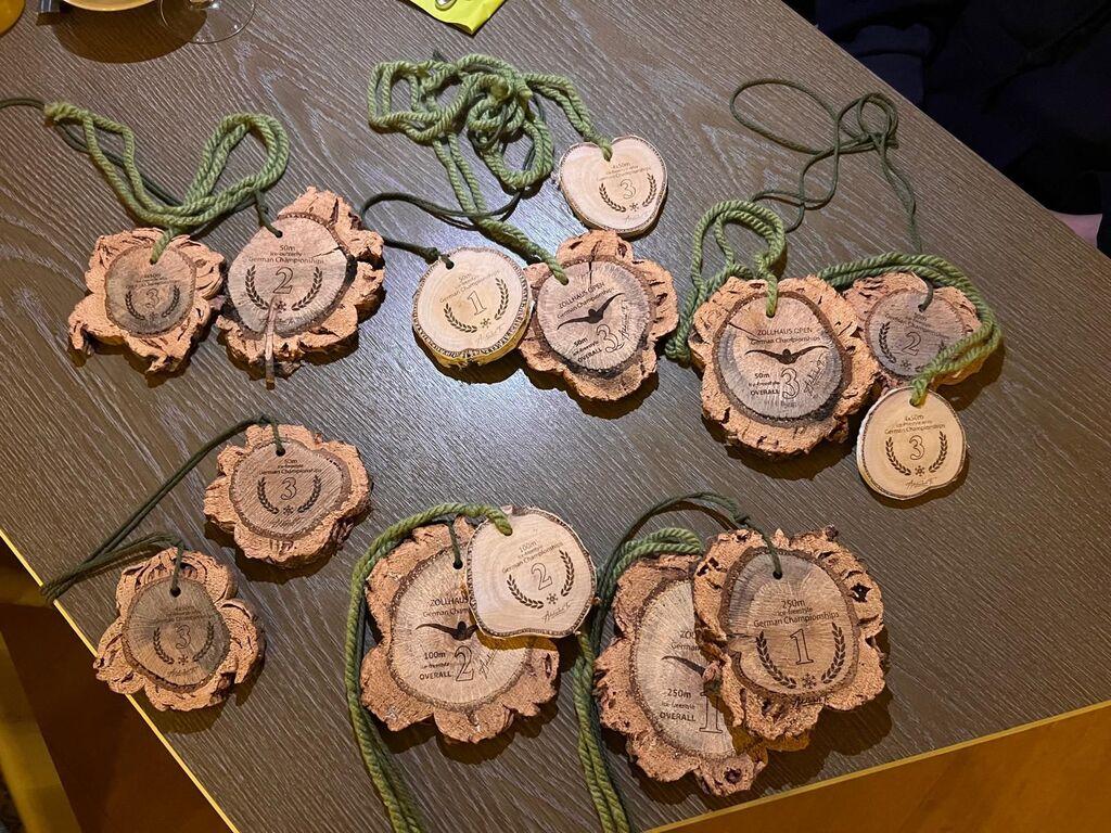 Im Anschluss fanden auch die Siegerehrungen statt. Alle vier von uns haben es mindestens zweimal aufs Podest geschafft. Allen voran war Max mit 1x gold, 1x silber, 1x bronze und sogar einmal dem ersten und einmal dem zweiten Platz in der altersübergreifenden Gesamtwertung, der Deutschen Meister. Gina belegte im 50m Delfin den verdienten 2. Platz, Alexia holte knapp den 2. Platz in ihrer Altersklasse und insgesamt den 3. Platz der Frauen, und Björn sicherte sich in seiner AK (Altersklasse) den 1. und insgesamt den 3. Platz. Die größte Überraschung kam jedoch am Ende, als verkündet wurde, dass wir in der 4x50m Staffel den 3. Platz holten, und das mit 2 Männern und 2 Frauen, während der 1. und 2. Platz mit einer Teamaufstellung von 3 Männern und einer Frau an den Start gegangen sind. Die Medaillen waren, genauso wie der Wettkampf, einzigartig, aus Holz gefertigte Scheiben mit einem Brandaufdruck. Leider war danach der Tag auch schon vorbei und wir mussten zurück in die (warme) Realität.