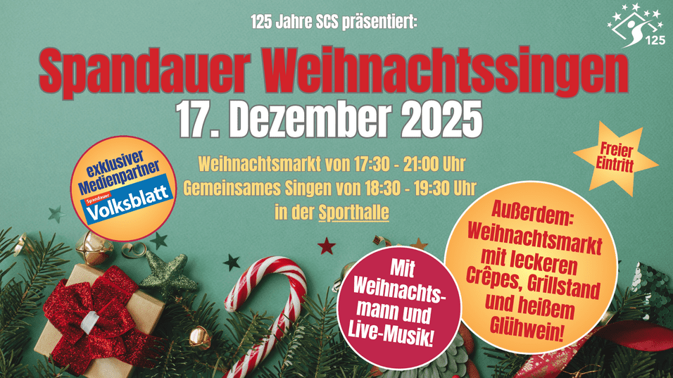 Am 17. Dezember 2025 laden wir wieder zum traditionellen Spandauer Weihnachtssingen ein. Von 17:30 - 21:00 Uhr wird es einen kleinen Weihnachtsmarkt im Stadion geben. Hier gibt es klassische Weihnachtsleckerein, sowie Kinderpunsch und Glühwein.