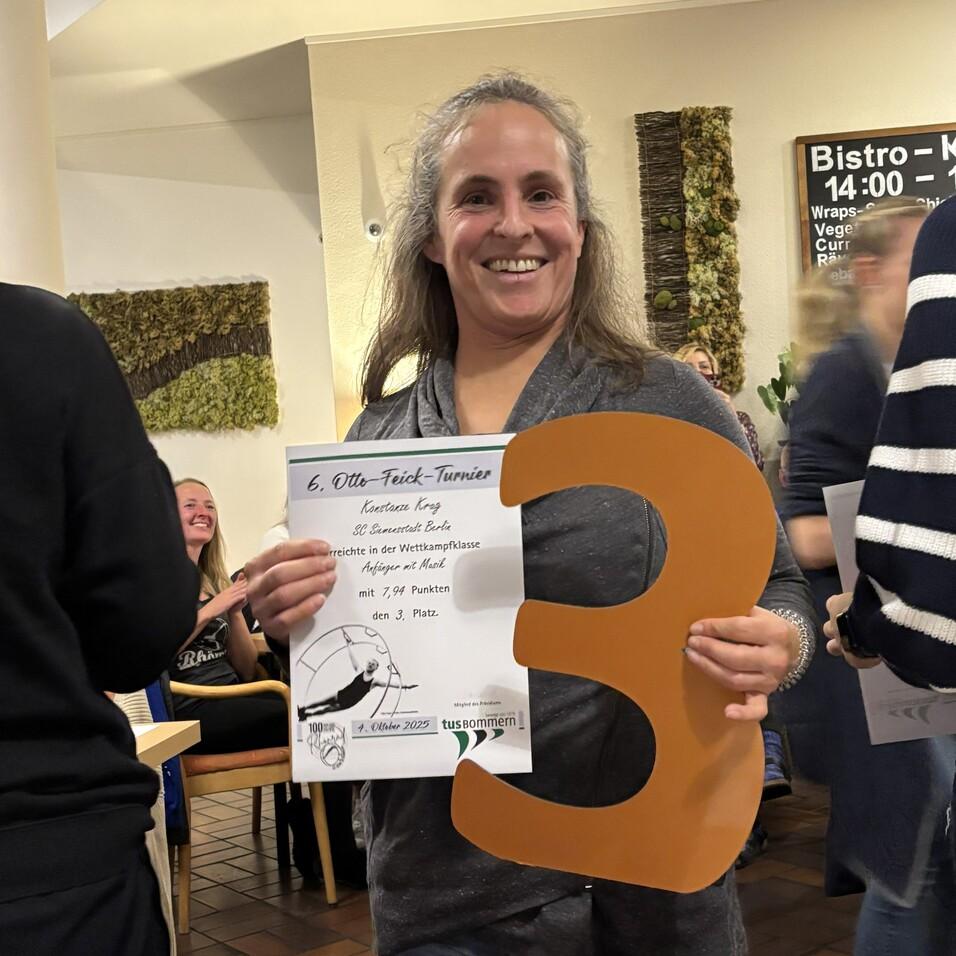 Am 4. Oktober 2024 fand das diesjährige Otto-Feick-Turnier in Bommern bei Witten statt, an dem zwei unserer erwachsenen Turnerinnen sowie eine Trainerin mit Vergnügen und Erfolg teilnahmen. Überzeugen konnte vor allem die gezeigte A-Klasse Musikkür und wurde mit einem sehr guten dritten Platz belohnt. Außerdem erreichten die Turnerinnen einen zweiten, sowie einen guten sechsten Platz. Neben dem Wettkampf standen schöne Spaziergänge in den Wäldern am Rande des Ruhrgebietes sowie gemeinsame Abendessen zum Austausch mit Rhönrad-Enthusiasten aus ganz Deutschland auf dem Programm.
