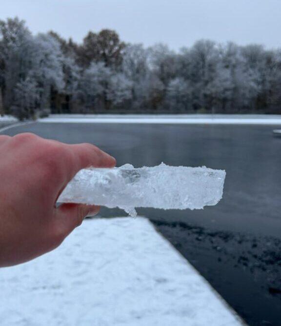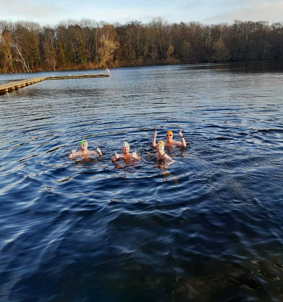 Seit einigen Jahren und insbesondere, seit wir im letzten Jahr das Eisschwimmen für uns entdeckt haben, ist es bei einigen von uns zur Tradition geworden, sich am Neujahrstag im Strandbad Jungfernheide zu treffen und in den eisigen Fluten anzubaden. In diesem Jahr trafen sich Max Kuczaj, Daniel Gromes, Julia Lipinski, und – worüber ich mich besonders freute – Neuzugang Falk Cramm zu dieser Neujahrstradition. Als Zuschauer waren die üblichen Verdächtigen (Uschi Wegner, Petra und Andrzej Kuczaj, Monika Henze-Roth, Udo Henze und Elina Meyer) dabei, die uns nicht nur mit guten Ratschlägen zur Seite standen, sondern auch fotografierten, Sekt und Orangensaft sowie später warme Getränke reichten und uns beim Anziehen behilflich waren.